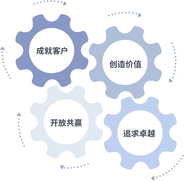 成就客户是一切决策的出发点,,,,创造价值是衡量所有工作的标准,,,追求卓越是我们做事做人的态度,,开放共赢是我们的格局也是最终的结果。。。。价值观的齿轮环环相扣,,,,推动着组织里的每个人不断向前。。